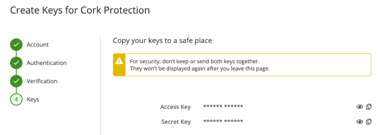 - After authenticating, Create Keys for Cork Protection will move to step 4 and present your keys.