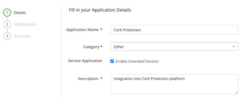 - Once the 30 minutes is up, you are ready to proceed. If your browser window was closed, you can get back to where you left off by navigating to Administration > Services > API and Platform Integrations > Your Application Integrations and then clicking the previously created application (Cork Protection)