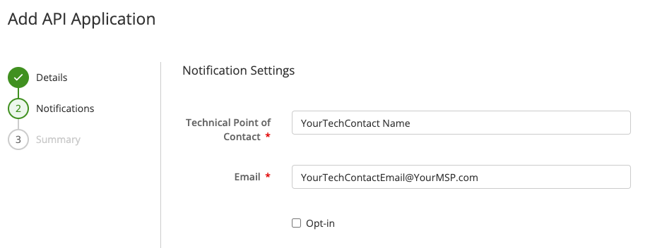 - On Step 2 of the Add API Application, fill out the Technical Point of Contact (Name) and Email of the member of your team who you wish to be the technical point of contact for any API related notifications and then click next.