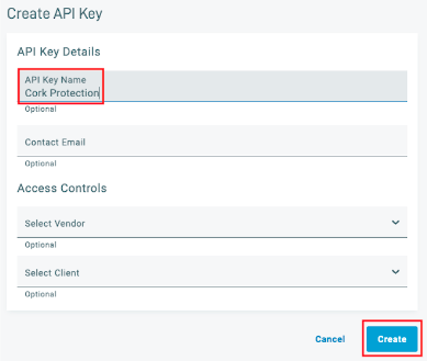 - In the right pane that opens, enter an API Key Name (Ex: Cork Protection) and click Create
