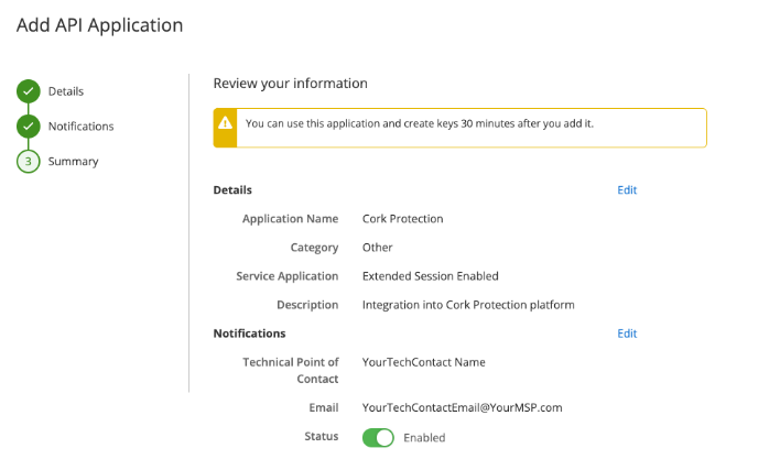 - On Step 3 of the Add API Application, verify all the information is correct, select whether you want Notifications Enabled or Disabled, and then click Add.