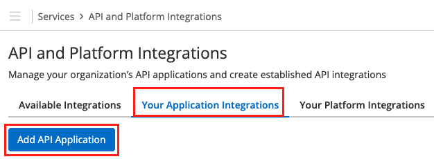 - On the API and Platform Integrations page, select Your Application Integrations, and then click Add API Application