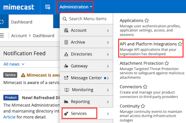 - Log into the Mimecast Administration Console with a user who has the Admin role