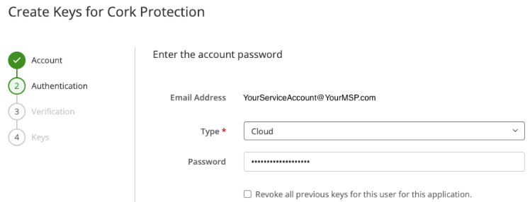 - On Step 2 of the Create Keys for Cork Protection, select the Type, enter the Password associated with the service account you chose to use. Make sure the option to Revoke keys is unchecked and then click Next