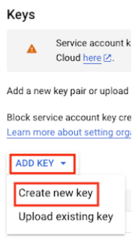 note: You may encounter the errorKey creation is not allowed on this service accountwhen creating the service account key. This is related to the organization policy constraintiam.disableServiceAccountKeyCreationbeing enforced in your organization.