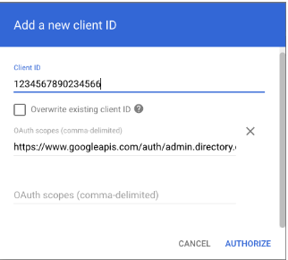 - https://www.googleapis.com/auth/admin.directory.domain.readonly,https://www.googleapis.com/auth/admin.directory.user.readonly,https://www.googleapis.com/auth/admin.directory.customer.readonly,https://www.googleapis.com/auth/admin.directory.group.readonly