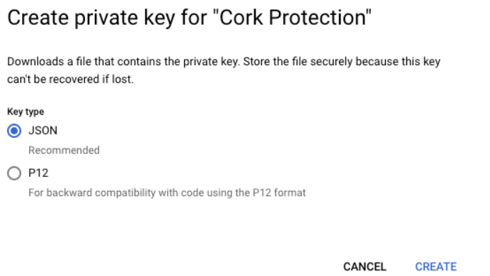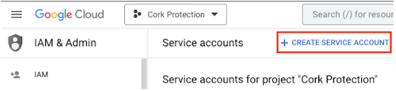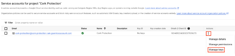 - After pressing done, you should land on the Service accounts screen. There you will see your newly created Cork Protection service account. Click the Actions icon and select Manage Keys
