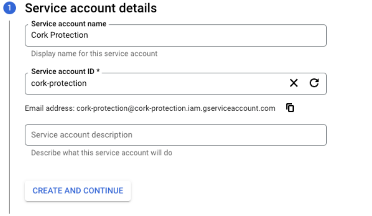 - On the Create service account screen, complete the Service account details and then click the CREATE AND CONTINUE button.