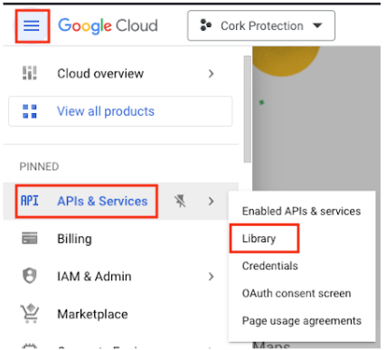 - Click the hamburger menu in the top left corner to open up the navigation menu. Select APIs & Services > Library