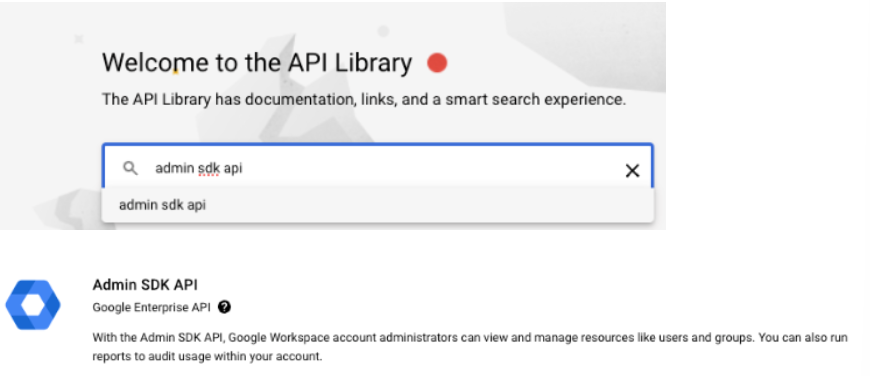 - Using the API Library search bar, search for admin sdk spi, and in the results, select the Admin SDK Api