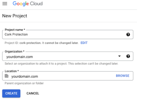 - Log into the Google Cloud Platform console ( https://console.cloud.google.com/ ) with an account that has super administrator privileges in the Google Workspace organization that you want to connect to Cork Protection
