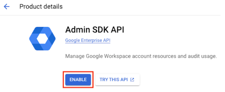 - On the Product details page, click the ENABLE button to enable the Admin SDK API.