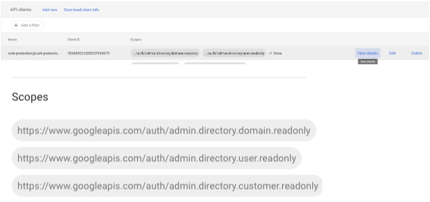 - Verification step, no action needed – In the API clients table, highlight the cork-protection row and select View details. Once the right side bar opens, verify that Client ID and scopes are correct.