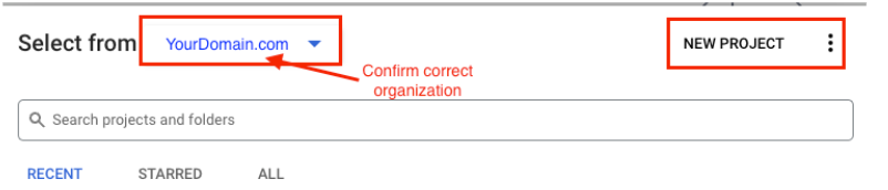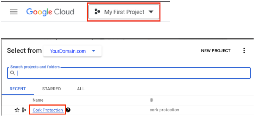 - In the window that pops up, verify that the Google Workspace organization that you want to connect to Cork Protection is selected in the “Select from” dropdown. Once confirmed click New Project.